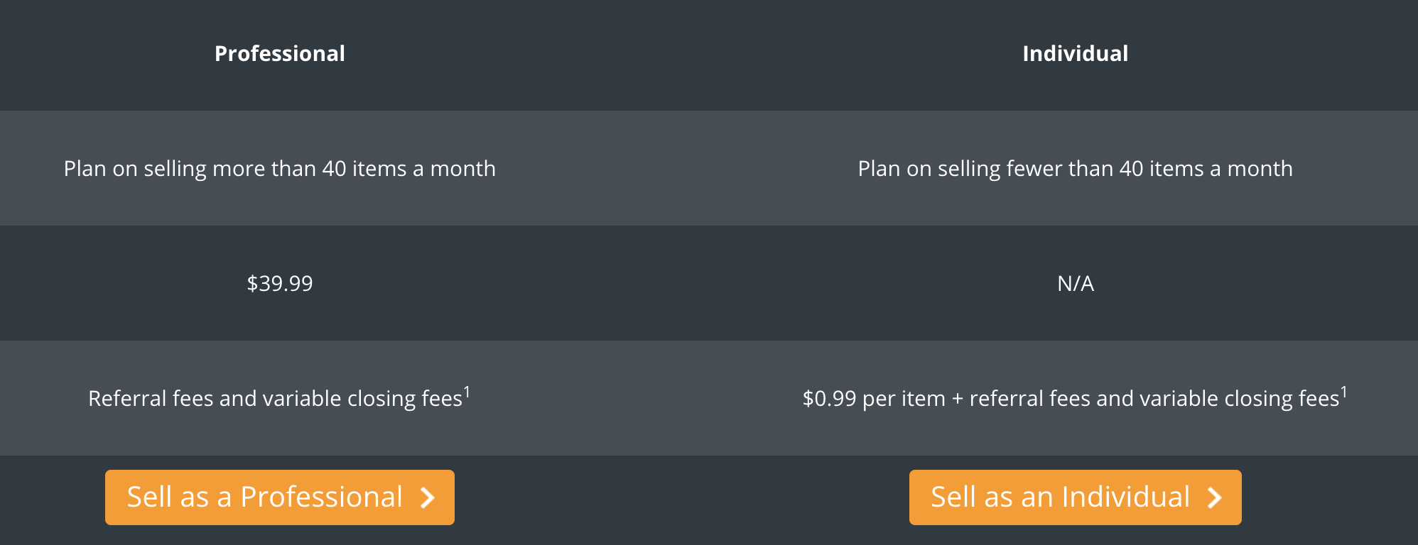 For anything beyond 40 items (which is likely most of you reading this), you’ll head for an Amazon Professional Seller’s Account.