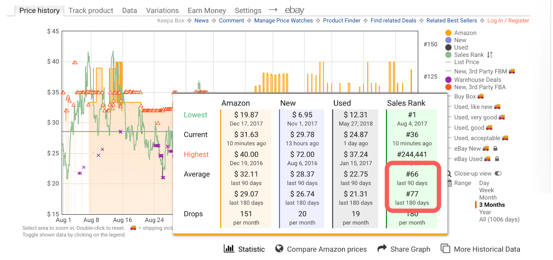 Forget that Amazon is on this listing for this post. Looking at the Statistics for this product, we can clearly see the average BSR for 90 and 180 days. Let’s use 180 days as our average BSR rank for calculating our average sales volume.